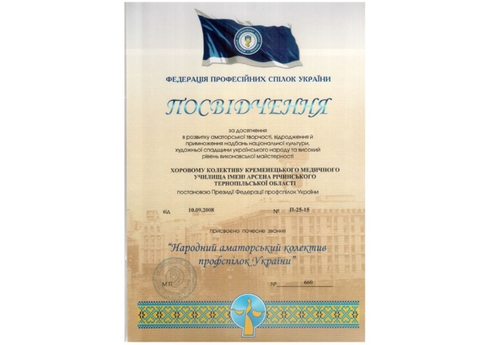 Упродовж багатьох років поспіль колективи художньої самодіяльності коледжу здобували призові місця в обласних оглядах-конкурсах серед 20 закладів фахової передвищої освіти. У 2008 році хоровому колективу коледжу було присвоєно звання народного аматорського колективу профспілок України, того ж року хор став лауреатом гран-прі Всеукраїнського фестивалю мистецтв «Ліра Гіппократа – 2008» та дипломантом Другого Всеукраїнського фестивалю колядок та щедрівок в Острозі.